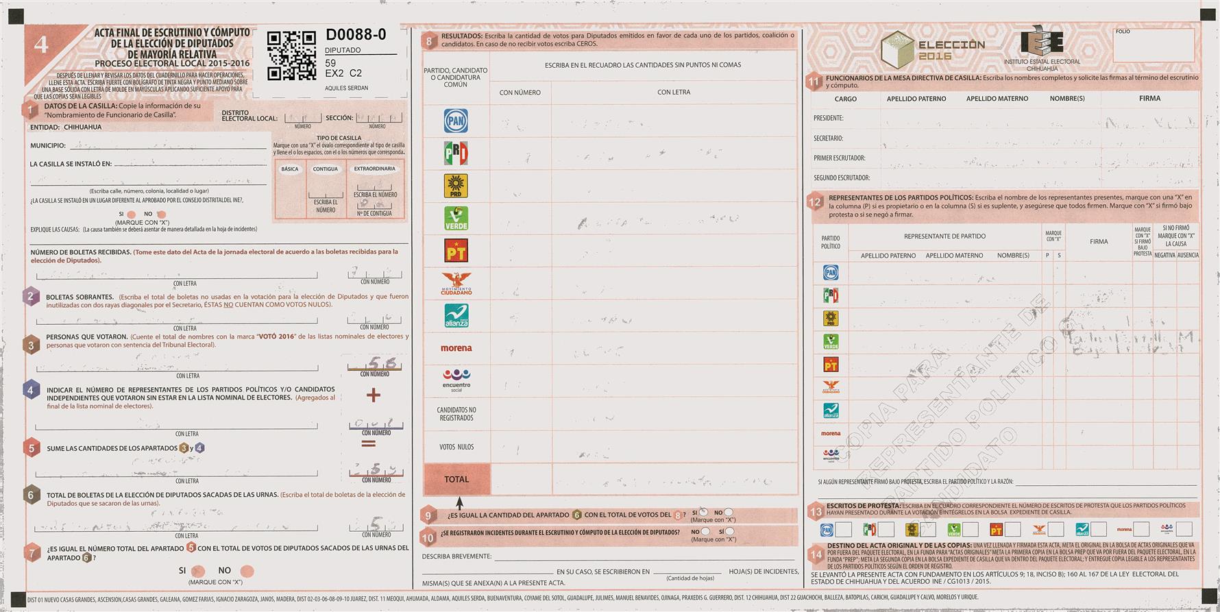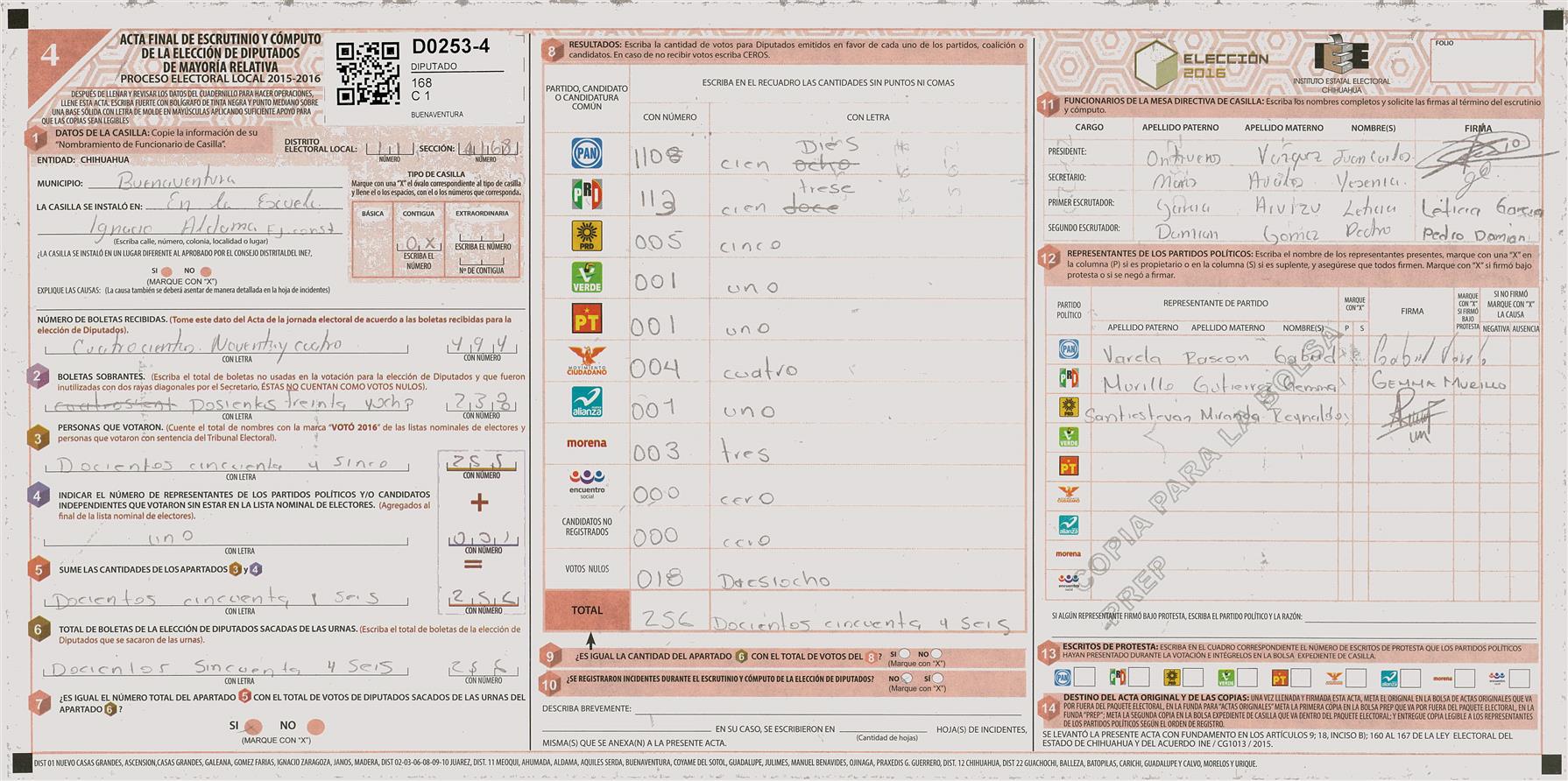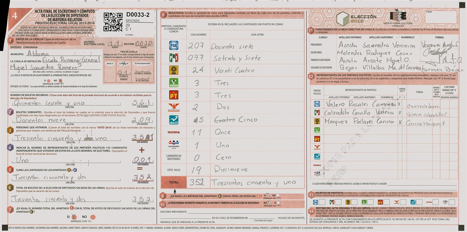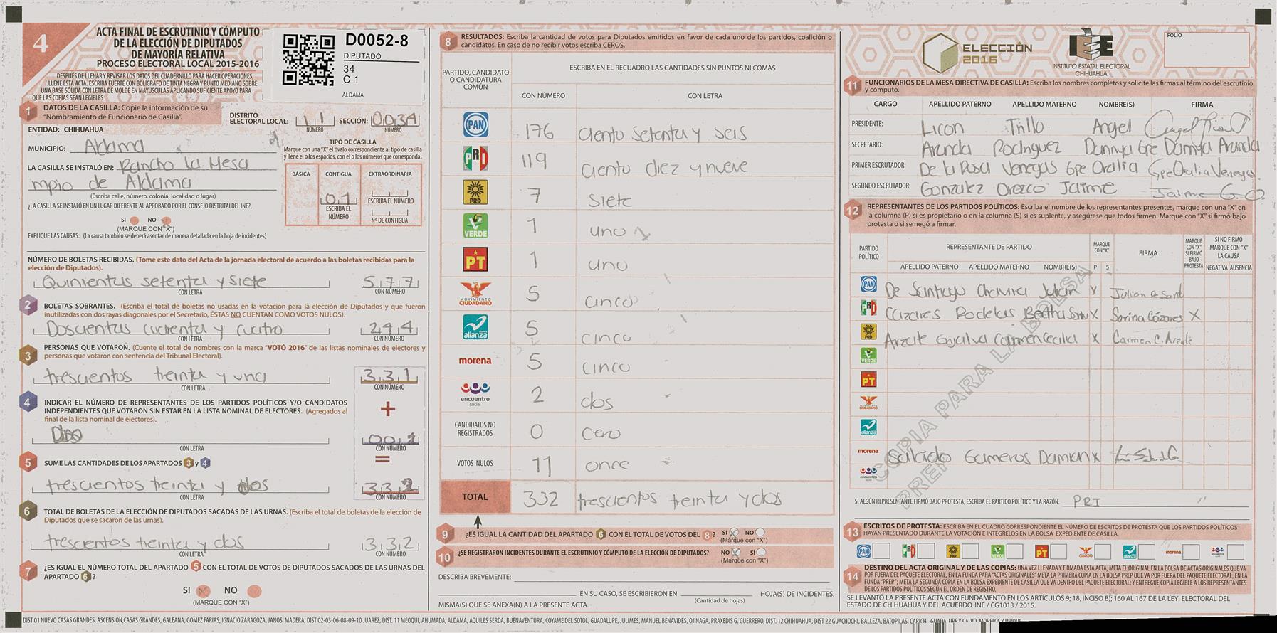 RESULTADOS POR CASILLA DEL MUNICIPIO DE 11 MEOQUI PARA LA ELECCIÓN DE DIPUTADOS