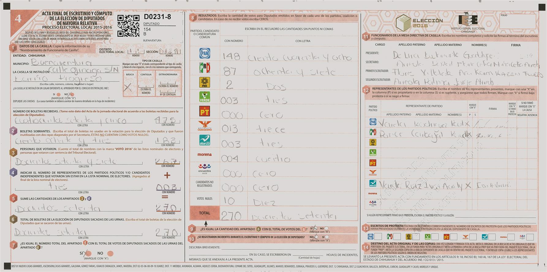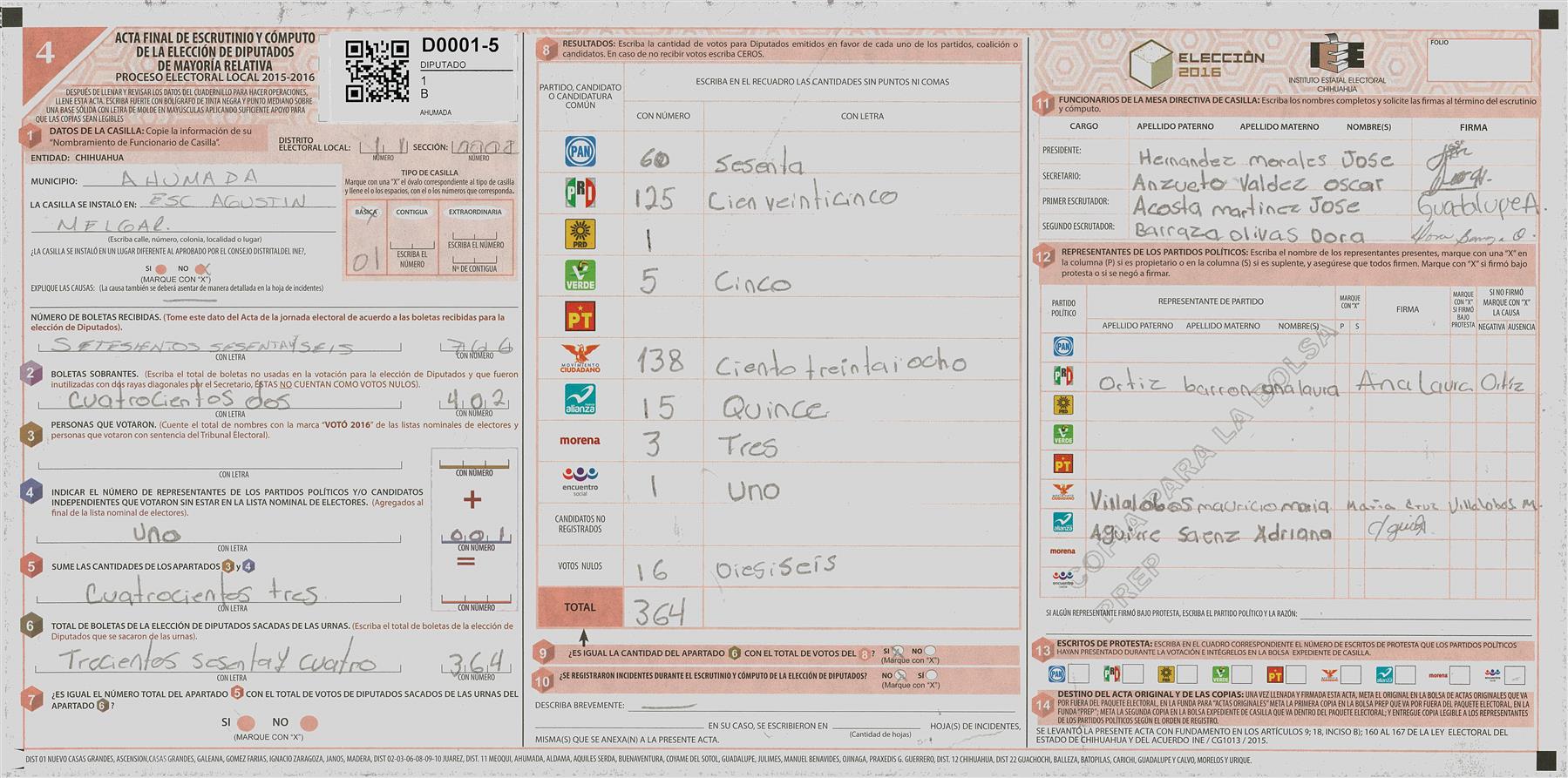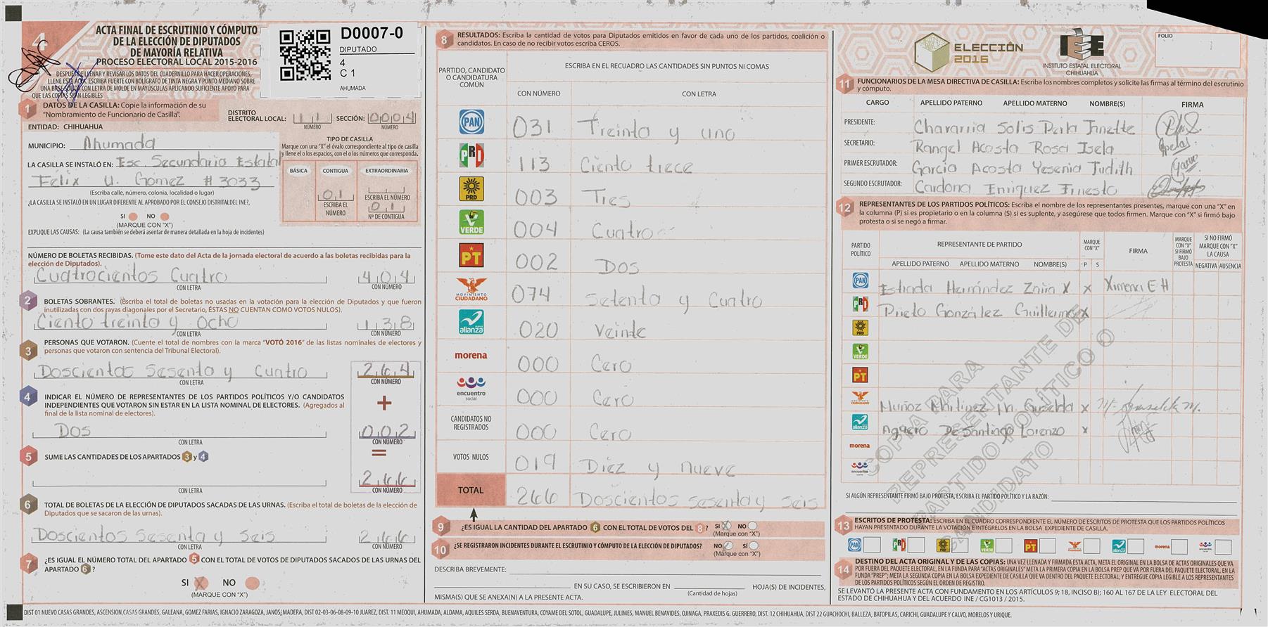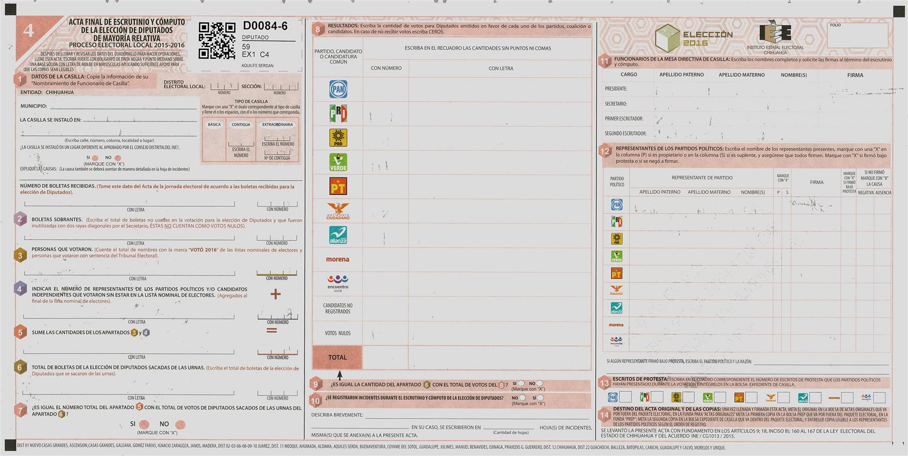 RESULTADOS POR CASILLA DEL MUNICIPIO DE 11 MEOQUI PARA LA ELECCIÓN DE DIPUTADOS